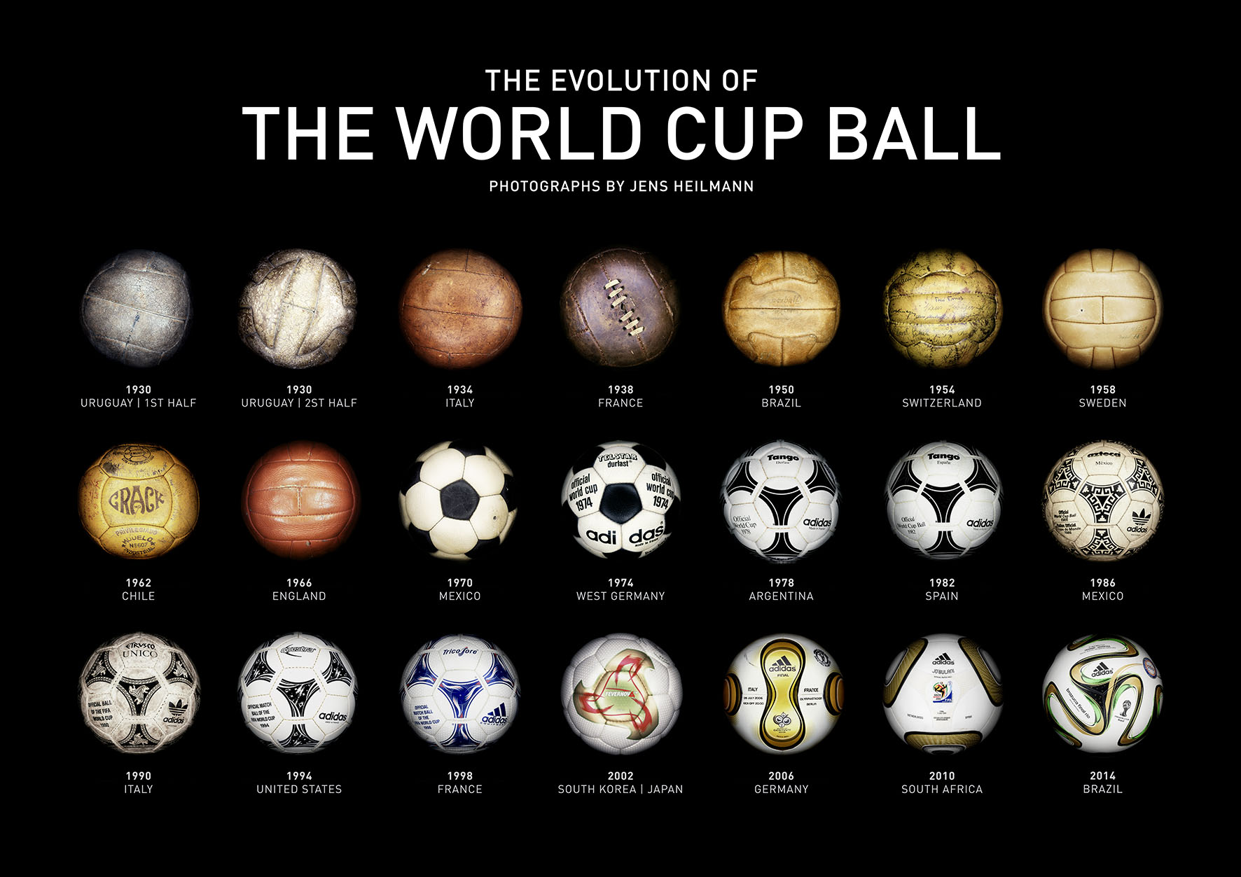 Jens Heilmann went to Preston, England, in order to photograph the footballs of the 1930 and 1966 World Cups. He wrote to several football associations, companies, museums, always on the hunt for original balls that had been in World Cup play. He sent e-mails around the globe. He asked for permission to take pictures, inquired about the possible journeys a certain ball could have made.